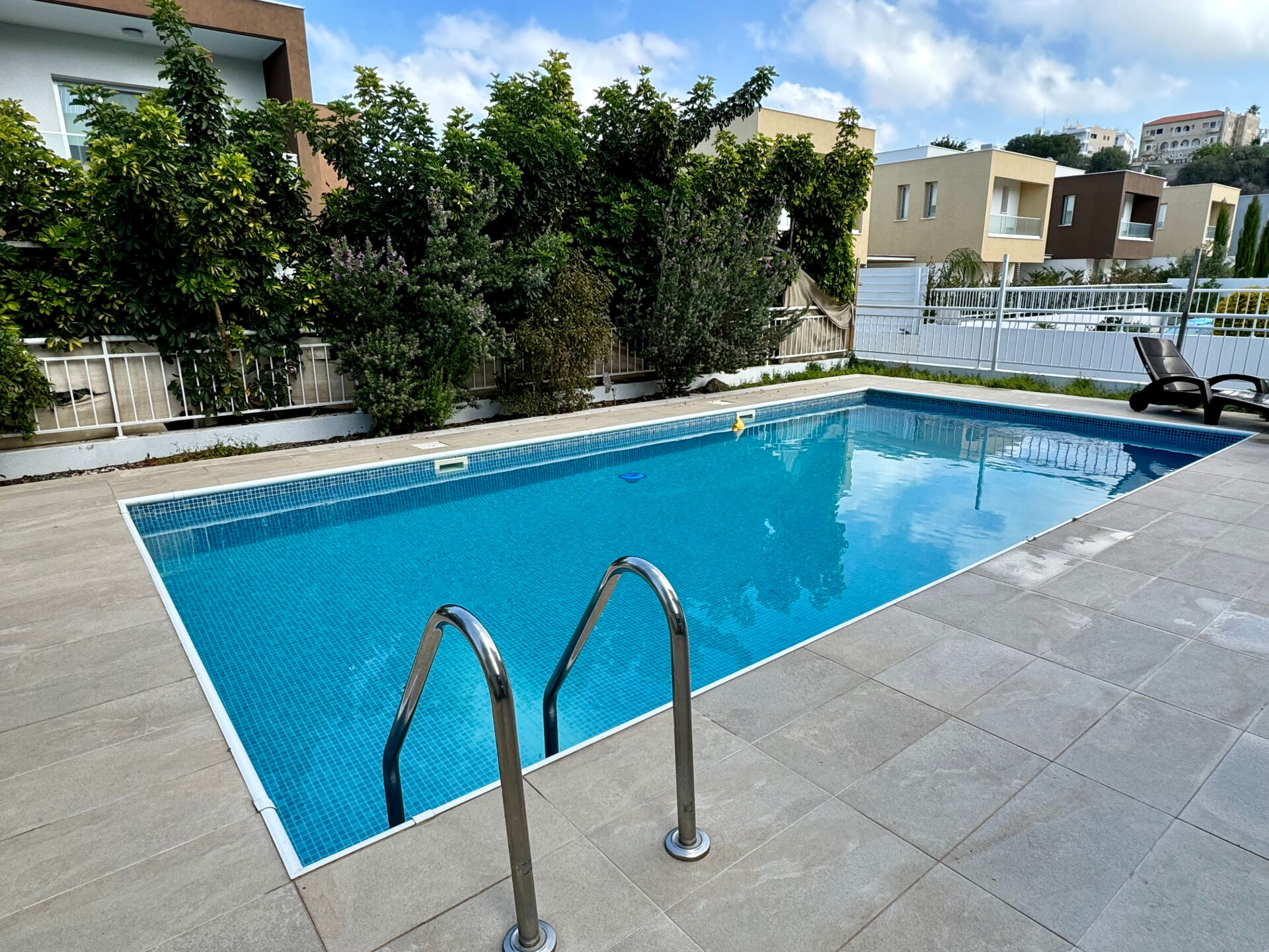 Willa Bajeczny Cypr posiada prywatny basen do użytku Gości w willi. Basen jest o wymiarach 4 m x 12 m, i głębokości stopniowanej, od 90 cm do 170 cm. Wokół basenu jest nowoczesny taras, 1 zejście do basenu. Basen posiada prywatną pompę do filtrowania w trybie automatycznym i ciągłym, a także nocne oświetlenie umożliwiające korzystania z basenu przez 24 h na dobę. Basen jest systtematycznie chlorowany i wówczas przez okres czyszczenia basenu nie można z niego korzystać, zwykle w nocy. Basen prywatny w tym klimacie, w szczególności latem jest koniecznością. Wiekszość willi w Pafos nie posiada prywatnego baseny tylko miejski lub społeczny, co wiąże się z trudnościami w korzystaniu i czystością takich basenów. A więc proponujemy zawsze wybierać prwatny basen do dyspozycji Gości willi.